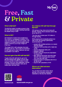 MyTest is a NSW Ministry of Health initiative designed to improve access to free HIV self-test kits through vending machines located across NSW. These self-tests provide a confidential and convenient option for individuals to check their HIV status.