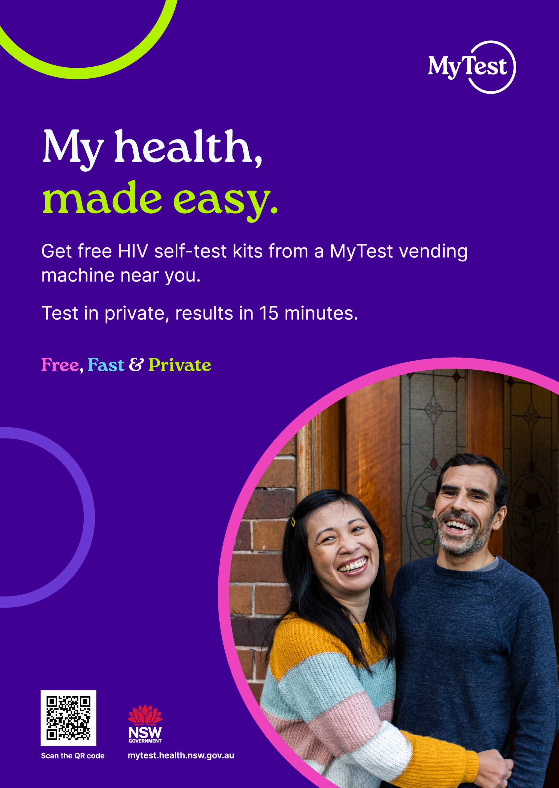 MyTest is a NSW Ministry of Health initiative designed to improve access to free HIV self-test kits through vending machines located across NSW. These self-tests provide a confidential and convenient option for individuals to check their HIV status.